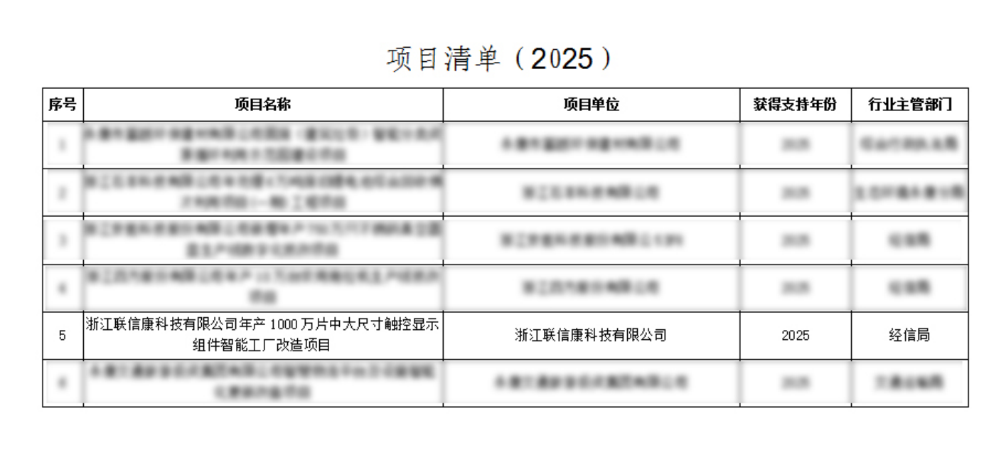 近日,浙江联信康科技有限公司报送年产1000万片中大尺寸触控显示模组智能工厂改造项目成功入选2025年度《工业重点行业领域设备更新和技术改造》两新项目支持计划并获得专项资金支持共计1031万元
